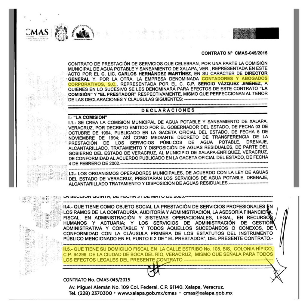 Otro de sus despachos, Contadores y Abogados Corporativos S.A. de C.V., tiene su domicilio fiscal en la Calle Estribo no. 108 Bis, en la colonia Hípico de Boca del Río, cómo consta en el contrato CMAS-045-2015 celebrado con el ayuntamiento de Xalapa para la auditoria a la cuenta pública 2015 de CMAS. Pero en una inspección física hecha al domicilio, se constató que en dicha dirección opera la empresa Sánchez Pineda, que no tiene ninguna relación con la firma de Vázquez Jiménez.