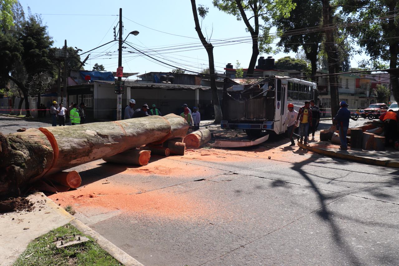 Personal de protección Civil municipal, tránsito del estado y Comisión Federal de Electricidad trabajan en el retiro del árbol.