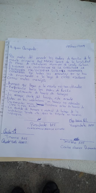 En punto de las 7:00 de la mañana de este lunes, los padres de familia tomaron la escuela primaria, en donde acusaron a la directora de no rendir cuentas de los recursos que recibe para mejoras del plantel, prepotencia hacia los padres de familia, perdida de apoyos y material de trabajo.