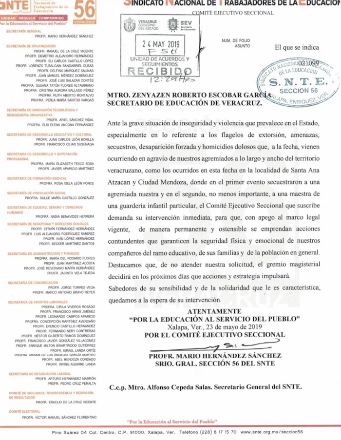 “En virtud de los últimos acontecimientos en relación a la seguridad en el estado y en lo particular el gremio magisterial, se convoca a una huelga de brazos caídos a realizarse el día de mañana lunes 27 de mayo del 2019. Con la encomienda de colocar letreros, mantas o carteles alusivos”, se convocó en un comunicado difundido el fin de semana.