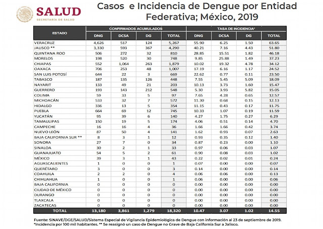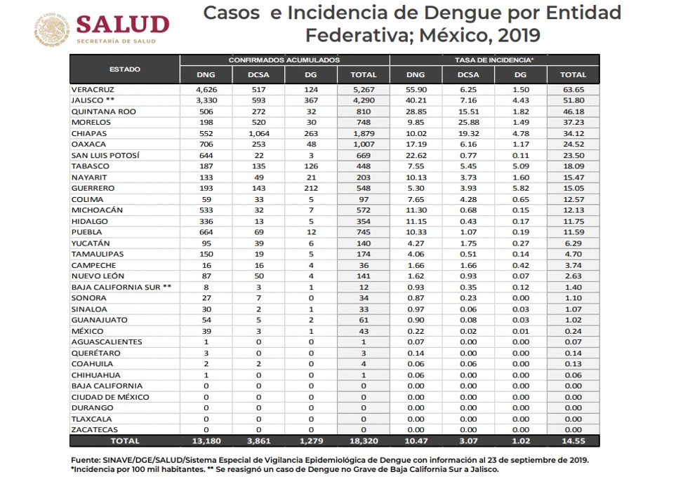 Según el informe de la Secretaría de Salud, Casos e Incidencia de Dengue por Entidad Federativa; México, 2019, muestra a Veracruz con 4 mil 626 casos de dengue no grave (DNG), 517 de dengue con signos de alarma (DCSA) y 124 de dengue grave (DG).
