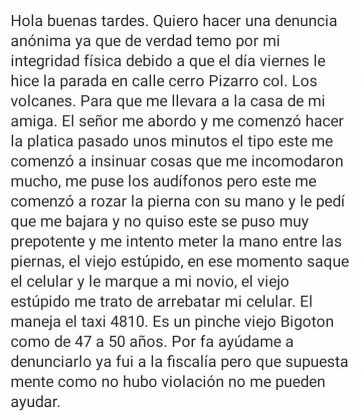 Él maneja el taxi 4810. Es un pinche viejo bigotón como de 47 a 50 años. Por fa ayúdame a denunciarlo ya fui a la fiscalía pero que supuestamente como no hubo violación no me pueden ayudar”, explica en su reclamo la agraviada.