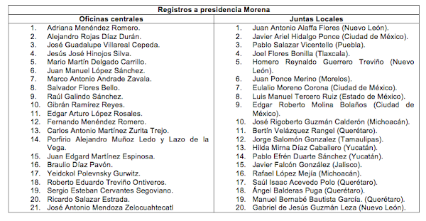 El registro de aspirantes a la presidencia y secretaría general del partido Morena ante el Instituto Nacional Electoral (INE) se llevó a cabo a partir del 5 de septiembre y concluyó este día a las 18:00 horas, con la solicitud de 105 candidaturas, 51 a la presidencia y 54 a la secretaría general de dicho partido político.