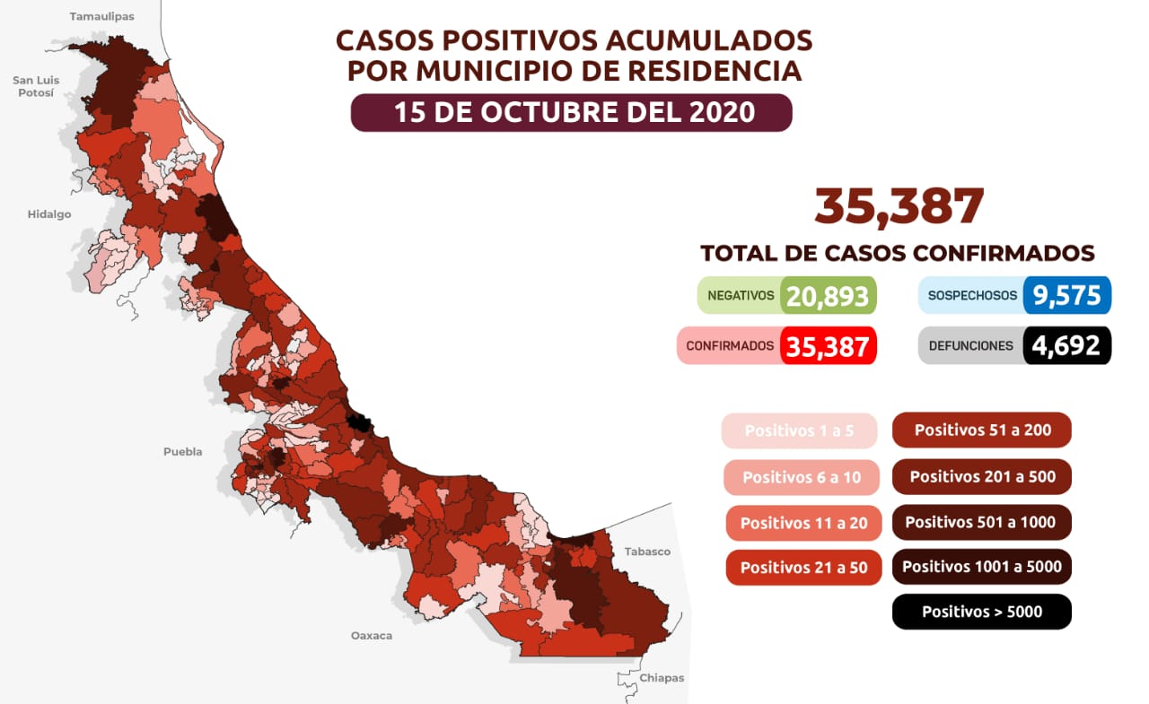 El número de positivos acumulados es de 35 mil 387 (+115 nuevos) en 205 municipios; los activos ascienden a 594 y representan el mayor riesgo por haber iniciado con síntomas en los últimos 14 días.