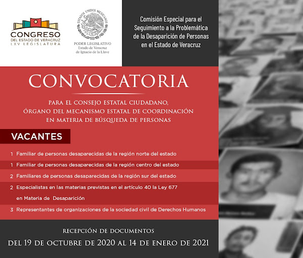 El Congreso del Estado emitió, este 19 de octubre, la Convocatoria Pública para cubrir nueve vacantes en el Consejo Estatal Ciudadano, Órgano del Mecanismo Estatal de Coordinación en Materia de Búsqueda de Personas.