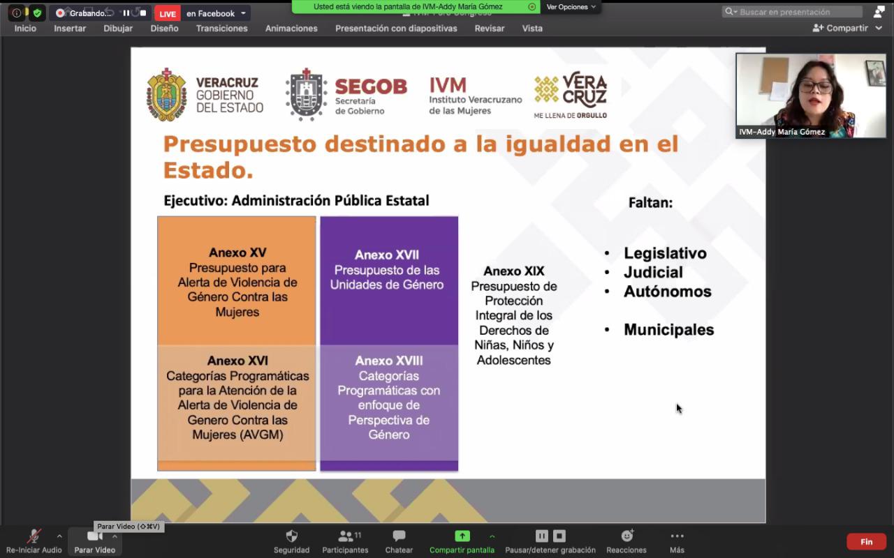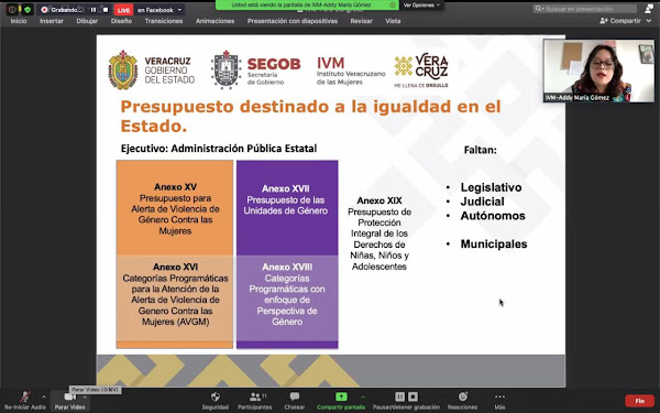 Para el Instituto Veracruzano de las Mujeres a través de la Subdirectora de Vinculación y Fortalecimiento Municipal Addy María Gómez existe un trabajo histórico de las mujeres para buscar la igualdad en los presupuestos, que han logrado que existan anexos transversales en el presupuesto estatal, sin embargo, aún falta involucrar presupuestariamente a los Poderes Judicial y Legislativo, a los órganos autónomos y a los ayuntamientos; mencionando que hay que capacitar más a los municipios pues faltan los indicadores y el etiquetado del recurso para los temas enfocados a la disminución de la brecha de desigualdad.
