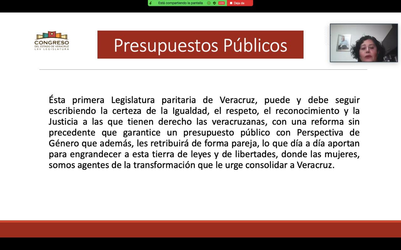 Es de esta manera como el Centro de Estudios para la Igualdad de Género y Derechos Humanos de la LXV Legislatura Estatal en apego a sus atribuciones contenidas en ley, analiza, asesora y abunda en la importancia de garantizar la perspectiva de género en los presupuestos públicos de la entidad, promoviendo que la primera legislatura paritaria en la historia del Poder Legislativo asuma y ejerza el principio de igualdad en los presupuestos públicos como generador de riqueza social para las y los veracruzanos.