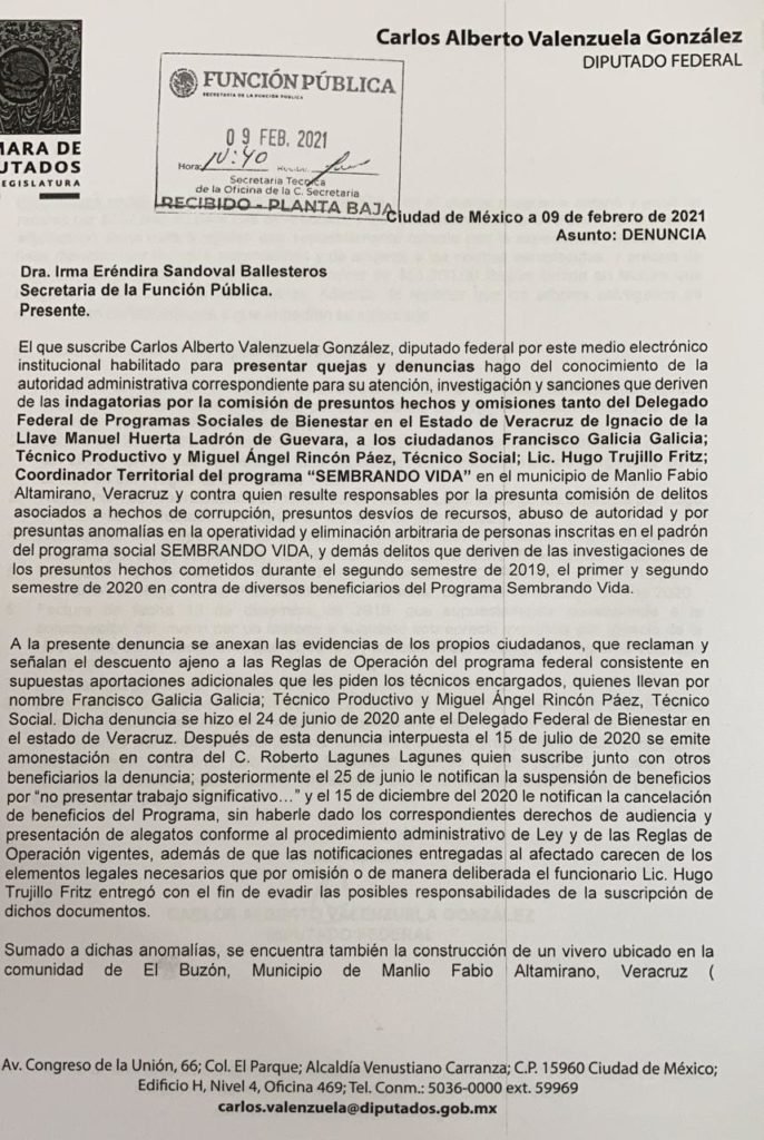 El PAN denunció al delegado de Veracruz, Manuel Huerta Ladrón de Guevara, ante la Secretaría de la Función Pública (SFP) por presuntamente desviar recursos del programa Sembrando Vida.