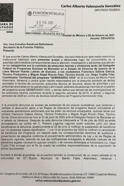“Presentamos la denuncia porque no están presentando el padrón de beneficiarios, lo cual se está prestando a distintos actos de corrupción por parte de los gestores de ese programa. Ya desde hace un año el delegado tenía conocimiento de este tipo de actos de corrupción, lo que vimos es que esas denuncias en lugar de investigarlas, dieron de baja a los beneficiarios que alzaron la voz para acusar los actos de corrupción”, explicó el panista Carlos Valenzuela.