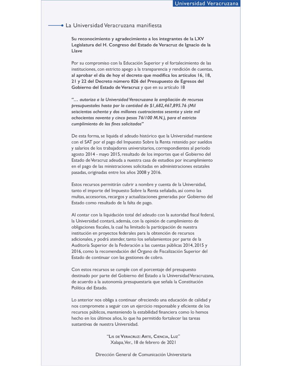 La UV celebró que el Congreso del Estado autorizó la solicitud para liquidar el adeudo histórico que la Universidad mantenía con el Sistema de Administración Tributaria, por el pago del ISR de sueldos y salarios de trabajadores, correspondientes a los ejercicios 2014 y 2015.