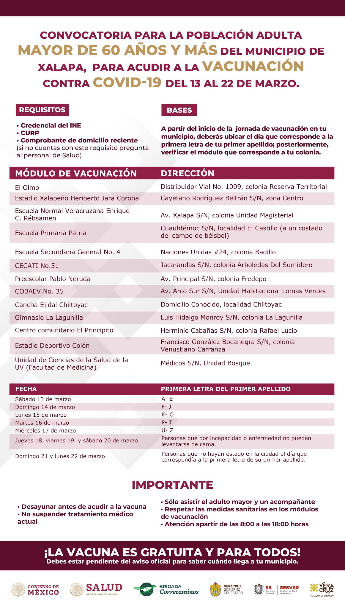 El Director de Salud Pública en Veracruz, Salvador Beristain Hernández informó que como parte del Plan de Vacunación Nacional, el próximo sábado 13 de marzo inicia la vacunación de adultos mayores con domicilio en el municipio de Xalapa.