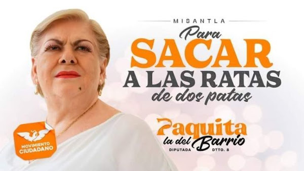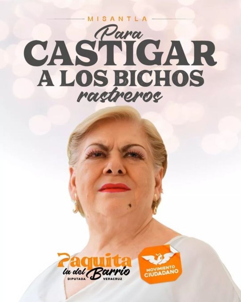 “Para castigar a los bichos rastreros” y “Para sacar a las ratas de dos patas”, son los lemas que Movimiento Ciudadano ha usado con la intérprete y empresaria para obtener el triunfo el próximo 6 de junio para ser la diputada del Distrito 8 de Misantla.