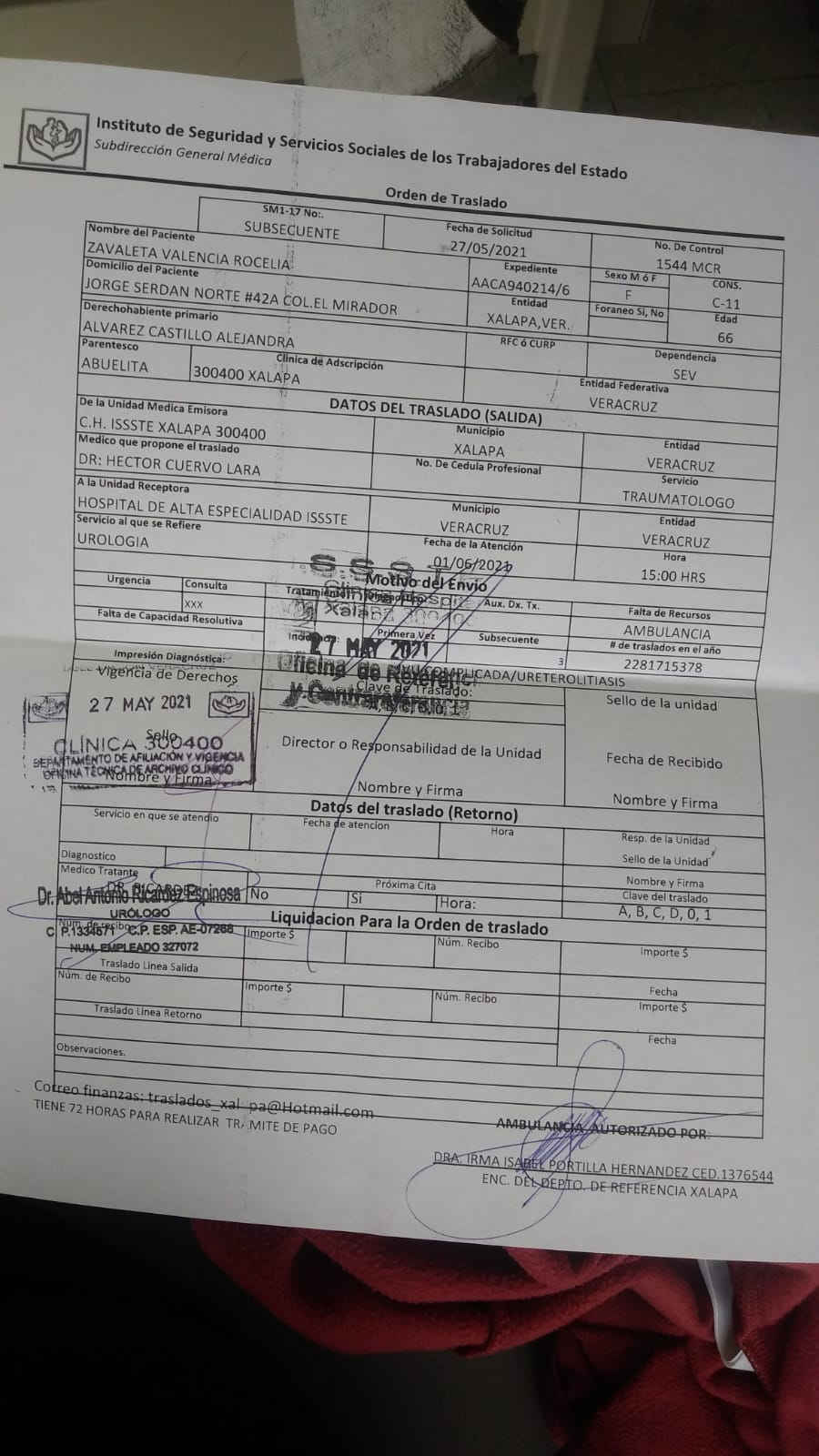 Isadora Castillo Zavaleta, hija de Roselia Zabaleta Valencia, Narró, que su madre empezó con un dolor en la cintura, le hicieron radiografía y tomografía y resultó que tenía problemas en la columna, le pidieron un estudio para mandarla a Veracruz, lo hizo particular para agilizar todo pero no le prestaron la ambulancia y tuvo que contratar ambulancia particular pagando el traslado a la clínica del ISSSTE de Veracruz, para que su madre fuera operada.