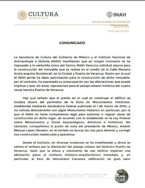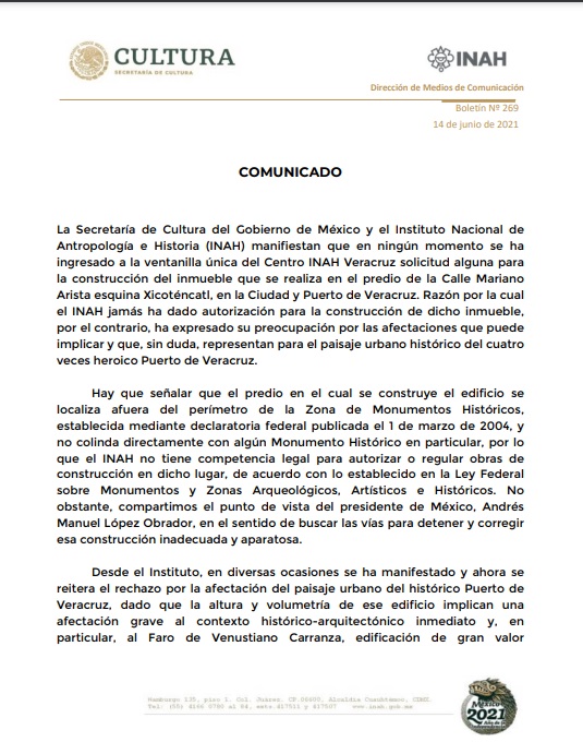 A las 22 horas, la Secretaría de Cultura y el INAH emitieron un comunicado para justificar que nunca se recibió en ventanilla una solicitud de edificación de un inmueble en el predio de la Calle de Mariano Arista, esquina Xicoténcatl, en la ciudad de Veracruz.