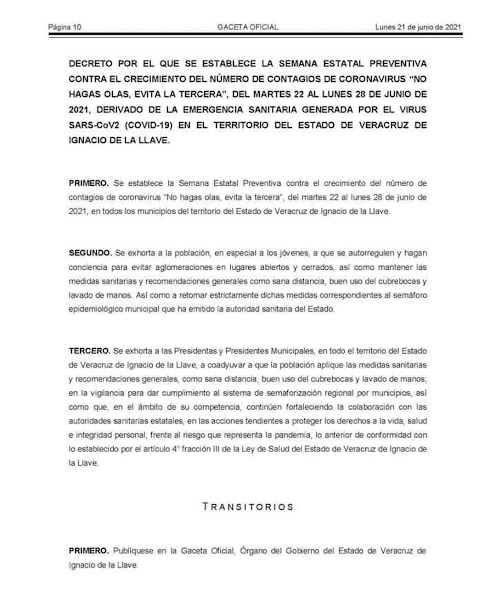 La funcionaria estatal aseguró que se tiene una "estrategia" de reactivación turística de verano, y que hay Veracruz para todos, sin embargo, desde Casa de Gobierno, el mandatario estatal emitia un decreto del 22 al 29 de junio, la semana estatal preventiva para los 212 municipios de Veracruz.
