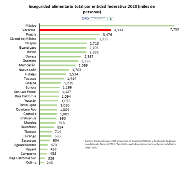 Este bajo nivel de ingreso ha llevado a gran parte de la población veracruzana a una situación de “inseguridad alimentaria”, lo cual significa que su “consumo alimentario está por debajo de los requerimientos necesarios o que padecen hambre de forma persistente durante periodos largos”, “porque no tienen acceso ni físico ni económico a suficientes alimentos inocuos y nutritivos para satisfacer sus necesidades alimenticias, a fin de llevar una vida activa y sana” (Coneval).