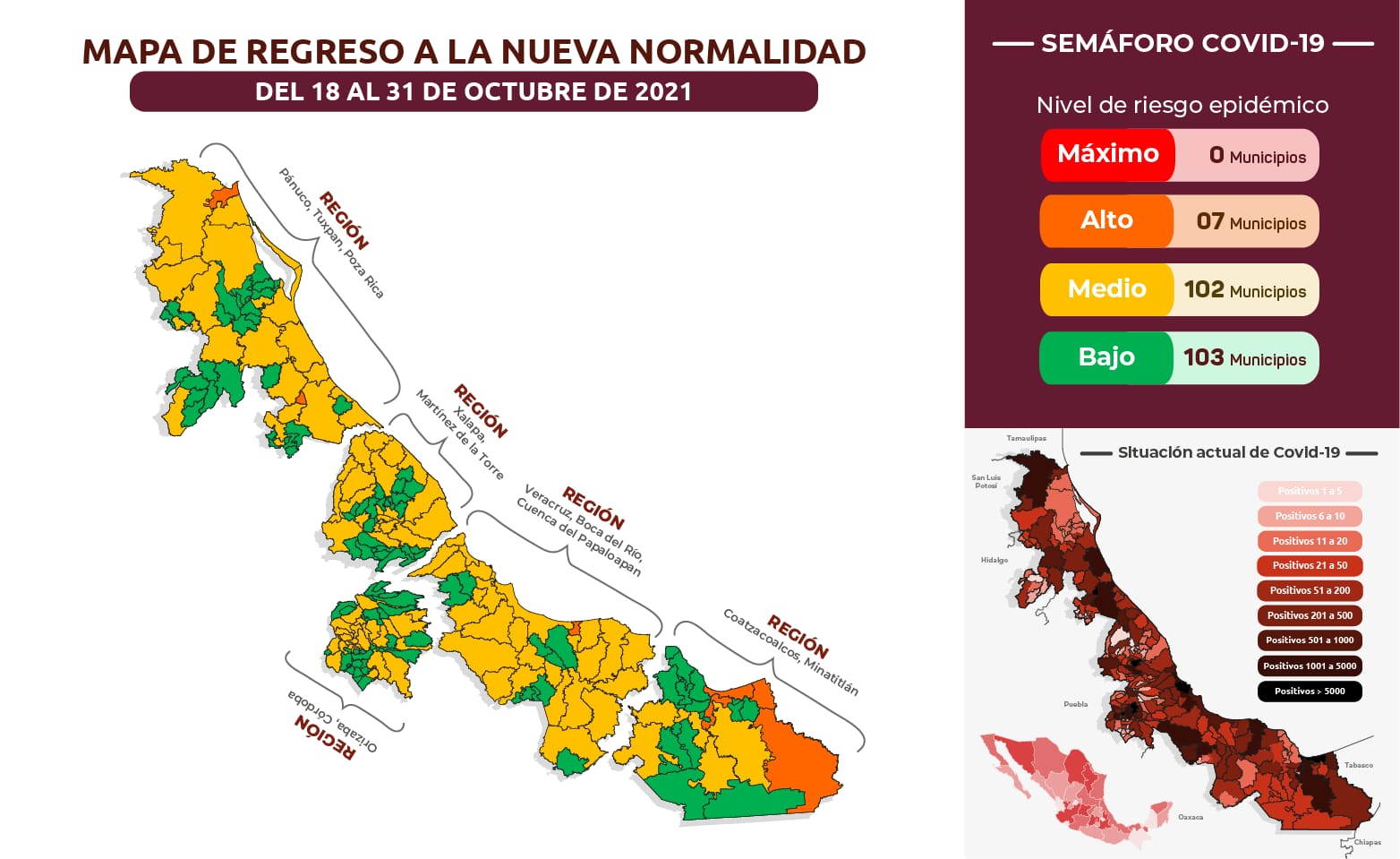El esfuerzo de todos, a la par de la vacunación, ha hecho posible que a partir del próximo lunes Veracruz no tenga ningún municipio en rojo y sí casi la mitad en verde. Ahora, el llamado es a la población y gobiernos de Coatzacoalcos, Cosoleacaque, Poza Rica, Pueblo Viejo, Las Choapas, Lerdo de Tejada y Agua Dulce para que refuercen las medidas sanitarias y dejen atrás el riesgo alto.