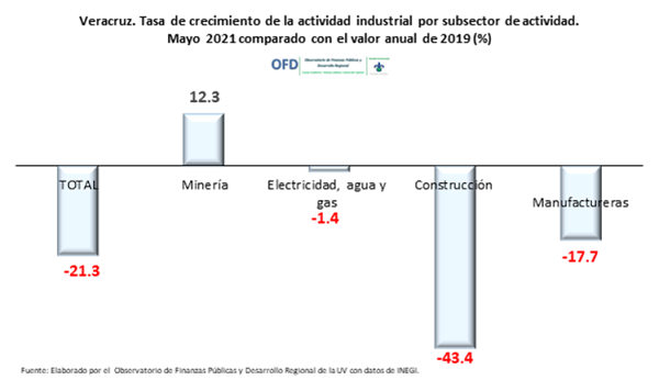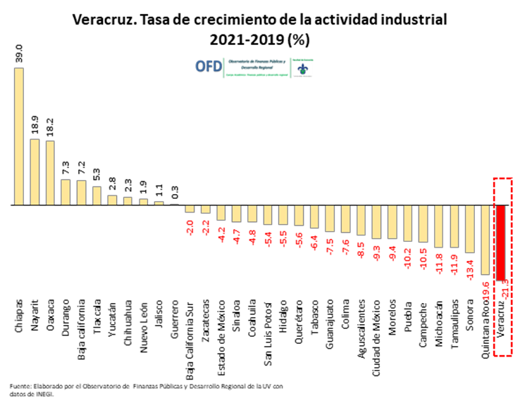 Veracruz se ubica actualmente en el último lugar a nivel nacional, por ser el Estado con mayor caída en la producción industrial durante la pandemia, con una variación porcentual de -21.3% en mayo de 2021 comparado con el valor observado en 2019. Y esto contrasta con el comportamiento de otros 11 estados, los cuales mostraron crecimiento en el mismo período, destacando Chiapas con un aumento de 29%, Nayarit con 18.9% y Oaxaca con 18.2%. Asimismo, se observa que otros 20 estados tuvieron decrecimiento productivo, pero no en la magnitud que presenta Veracruz, pues en 16 de estos, la reducción de la producción es, apenas, equivalente a la mitad o menos de la que registra la industria veracruzana.