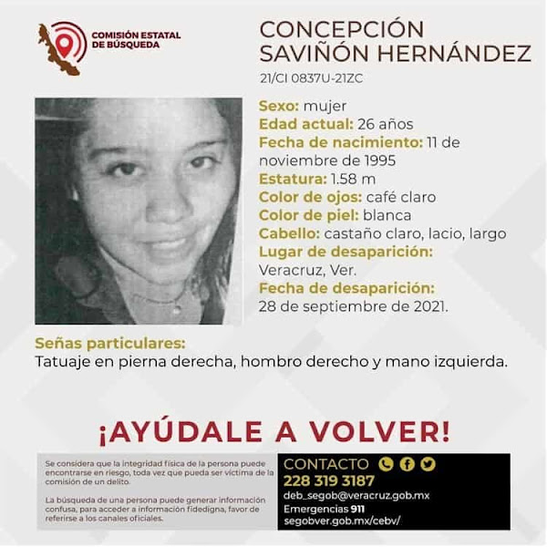 Concepción Saviñón Hernández, de 26 años, cumple más de un mes desde la última vez que fue vista, ya que el 28 de septiembre pasado se reportó su desaparición.