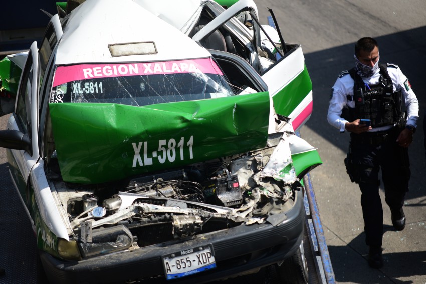 Según el reporte policiaco, el taxi se impactó detrás del camión urbano que estaba estacionado, luego de que un camioneta de modelo atrasado lo impactara por detrás y lo lanzara contra el camión.
