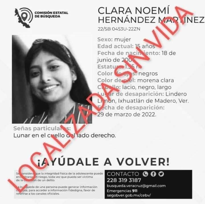 "A quienes comentaban o comentan ante un boletín de búsqueda, "¡ay para que tanto si debe estar con el novio!", créame que nosotros como familiares esperábamos que solo hubiera sido una travesura, pero que a fin de cuentas regresara sana y salva, lamentablemente Clara Noemí Hernández Martínez fue encontrada sin vida 4 días después de haber desaparecido, después de buscarla por tanto tiempo.