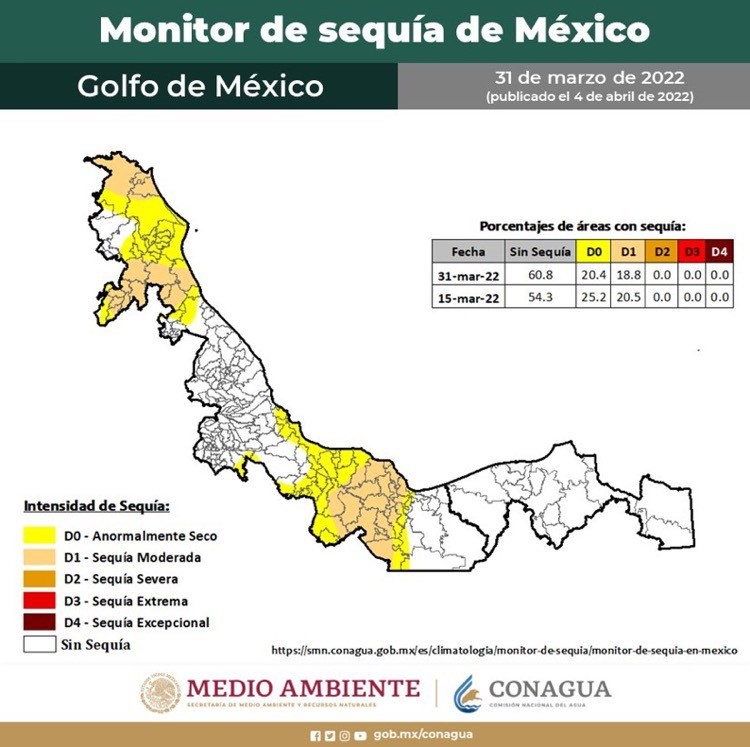 Sin embargo, aunque este año se tiene una mayor cantidad de municipios están en sequía moderada, no hay alguno con sequía severa. Además, comentó que el año más seco para Veracruz fue el 2019, cuando en el mismo periodo se tenían 72 municipios con sequía, de los cuales 25 tenían moderada y 47 sequía severa y llegaron a ser 203 municipios con algún grado de sequía.