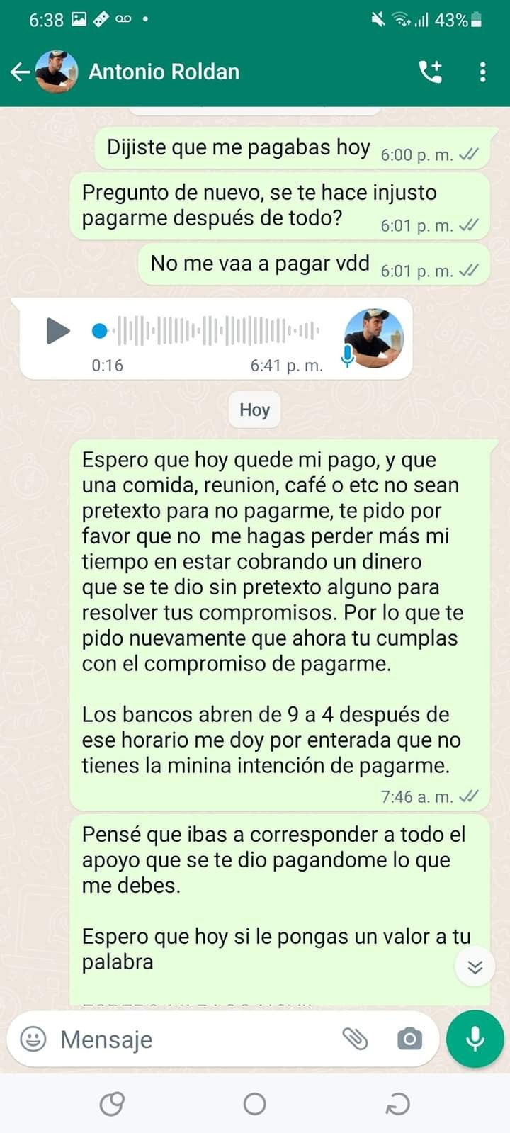 "Recurro a este medio y a los que sean necesarios para que cumplas el compromiso de pagarme, solo me has dado 50 mil y en pagos, me has dado mil vueltas para pagarme, pretextos tontos y no se vale, porque cuando tu me pedías dinero no te lo daba en pagos, siempre lo tuviste en el momento que me lo pedías. Te invito a que seas una persona responsable, y que como funcionario publico cumplas con tus obligaciones. Quien tenga alguna duda o requiera alguna información no duden en pedírmelo, tengo el sustento y prueba de todo", concluyó.