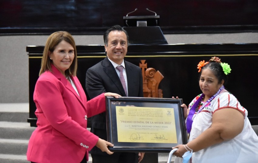 Con la presencia de los titulares de los poderes Ejecutivo y Judicial, la LXVI Legislatura del Congreso del Estado de Veracruz celebró Sesión Solemne en la que otorgó a la ciudadana Martha Soledad Gómez Atzin, fundadora del colectivo Mujeres de Humo, el Premio Estatal a la Mujer 2022, por su invaluable contribución al reconocimiento de la mujer indígena como transmisora de valores y conocimientos y a la cultura veracruzana desde la gastronomía.