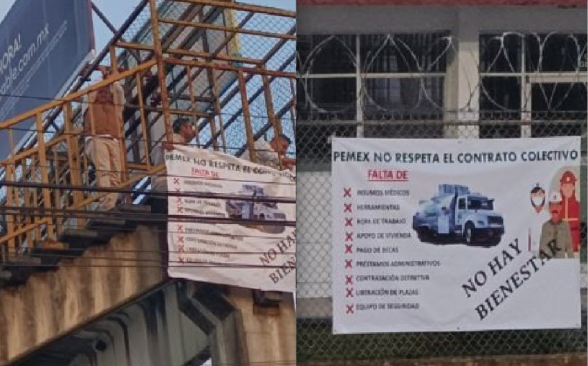 Los sindicalizados colocaron bambalinas en el puente peatonal ubicado en dicha colonia y frente a las instalaciones de la subestación de PEMEX en donde denuncian la falta de insumos médicos, herramientas, ropa de trabajo, apoyo de vivienda, así como pago de becas para sus hijos.