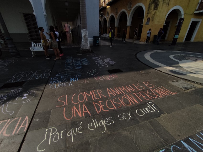Activistas del movimiento Animal Save realizaron una pinta afuera del palacio municipal de Veracruz con la finalidad de concientizar sobre el veganismo, el respeto a los animales y las consecuencias de las industrias ganadera y pesquera.