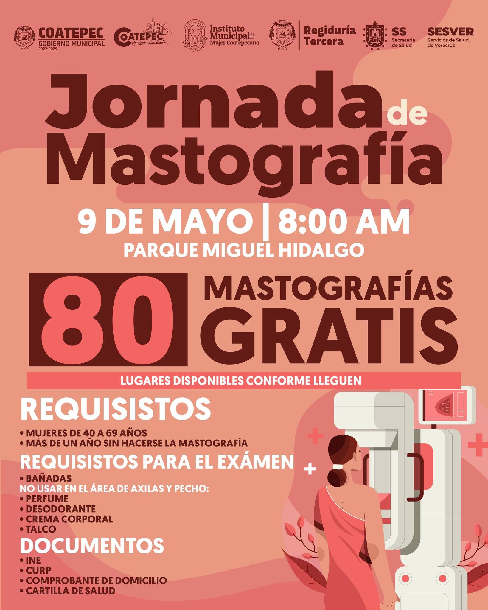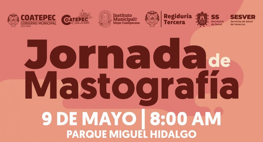 El H. Ayuntamiento de Coatepec que preside el alcalde Raymundo Andrade Rivera, a través de la regiduría tercera y el Instituto Municipal de la Mujer Coatepecana, invitan a la población femenina de 40 a 69 años a la Jornada de Mastografías el día 9 de mayo.