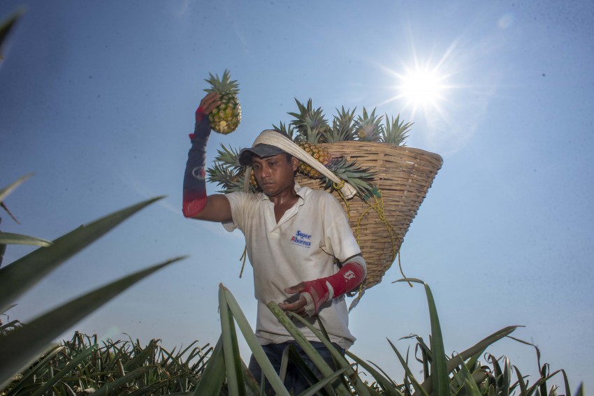 Aristeo Ramírez trabaja en un campo de piña. Es un joven larguirucho que se mueve con agilidad entre los surcos. Lleva pantalón oscuro y camisa de manga larga, que ajustó desde los puños hasta los codos con unas calcetas color rojo. Con un retazo de tela improvisó una suerte de capucha que le cubre la cabeza, el cuello y la cara.