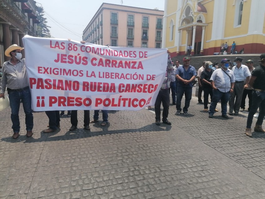 Hasta la plaza Lerdo arribaron unos 60 habitantes de Jesús Carranza, junto con el abogado Arturo Nicolás Baltazar y el diputado del Partido del Trabajo Ramón Ávila para acompañar a la esposa de Pasiano Rueda, Diana Aguilar que entregó un documento en Palacio de gobierno para exigir la liberación de su esposo el alcalde electo.