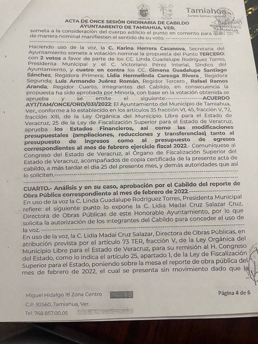 De acuerdo a un documento oficial del pasado mes de febrero se puede leer que la secretaría del ayuntamiento Karina Herrera Casanova asienta que se "aprueba por minoría", es decir, dos votos a favor y 4 en contra el estado financiero correspondiente al mes de febrero.