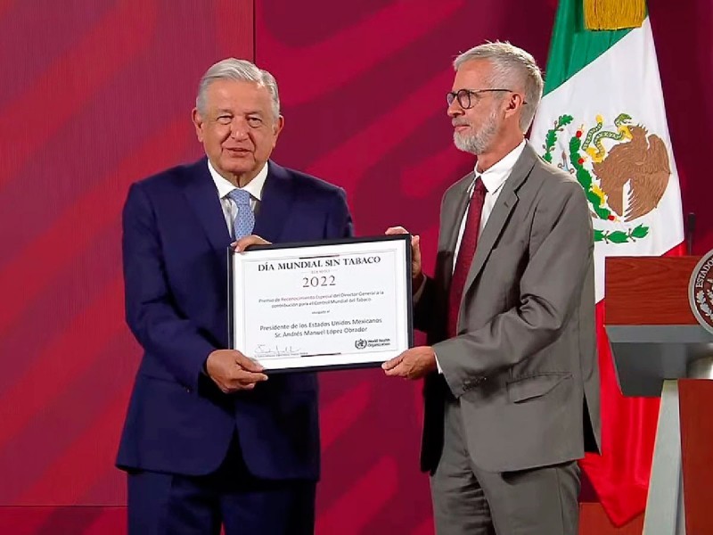 En el marco del Día Mundial sin Tabaco, el secretario de Salud (Ssa), Jorge Alcocer, informó que el mandatario recibió este reconocimiento por parte del representante de la OMS, Miguel Malo Serrano, mismo que es especial y sólo se entrega a pocos países, personas u organizaciones a los que se les reconocen sus acciones decididas contra el tabaco.