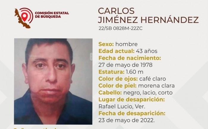 En el caso de Carlos Jiménez Hernández, la Comisión reporta que tiene 43 años de edad, tiene ojos color café claro; cabello negro, lacio y corto y como señas particulares tiene un tatuaje en el brazo derecho y pierna izquierda.