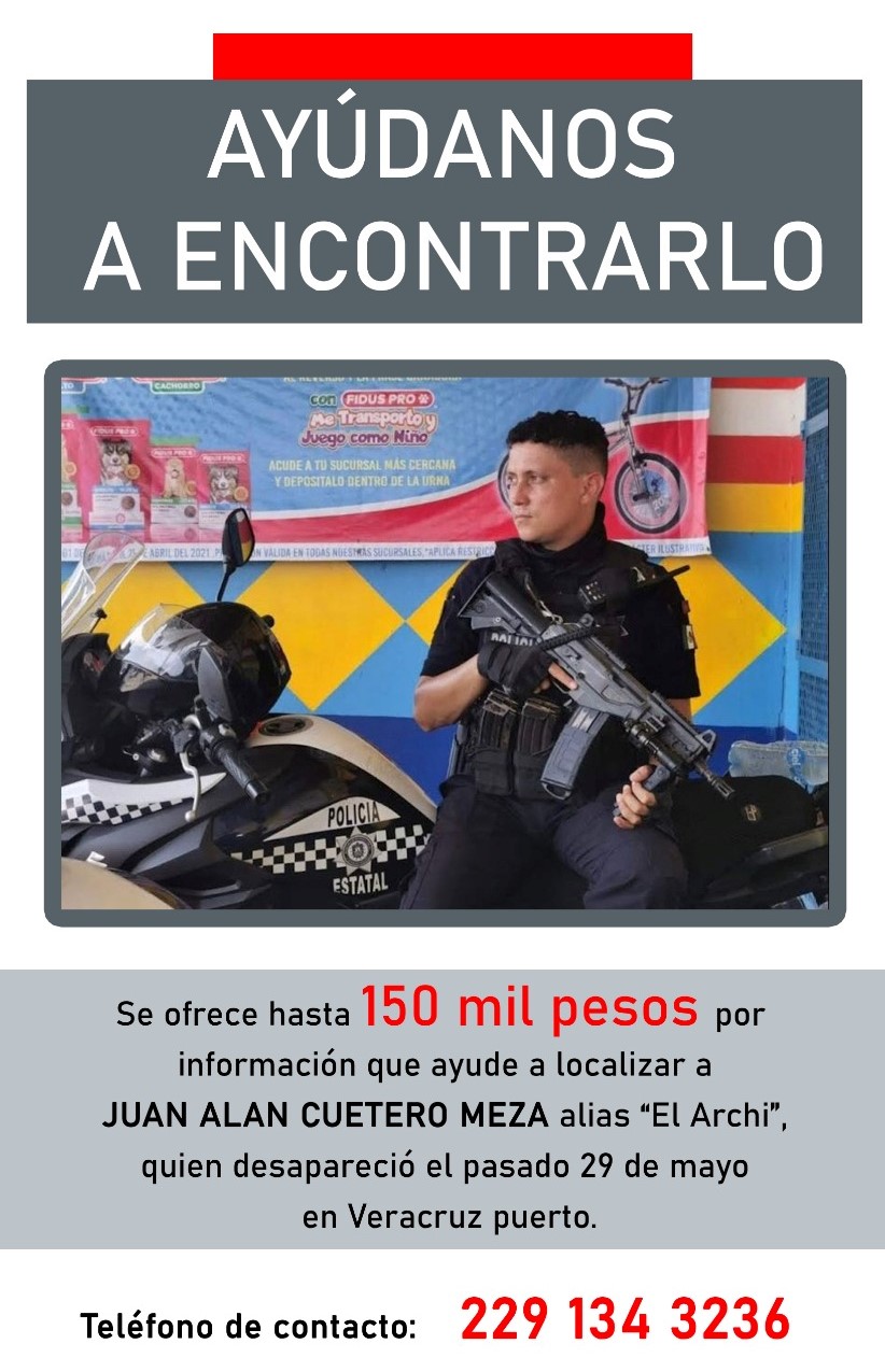 En redes sociales está circulando mensaje donde familiares y amigos del director de la Policía Vial, Juan Alan Cuetero Meza, ofrecen hasta 150 mil pesos por información que ayude a dar con su paradero, ya que está desaparecido desde la tarde del pasado 29 de mayo en el puerto de Veracruz.