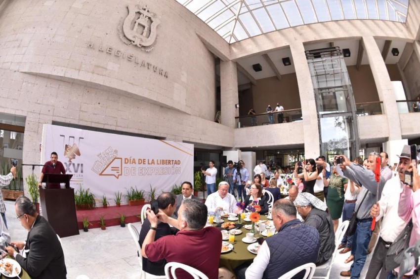 Una firme, clara y decidida defensa de la libertad de expresión como derecho humano indispensable para lograr una sociedad democrática, hizo el presidente de la Junta de Coordinación Política (Jucopo) de la LXVI Legislatura del Congreso del Estado de Veracruz, diputado Juan Javier Gómez Cazarín, durante el desayuno en el que convivió con las y los comunicadores de la entidad.