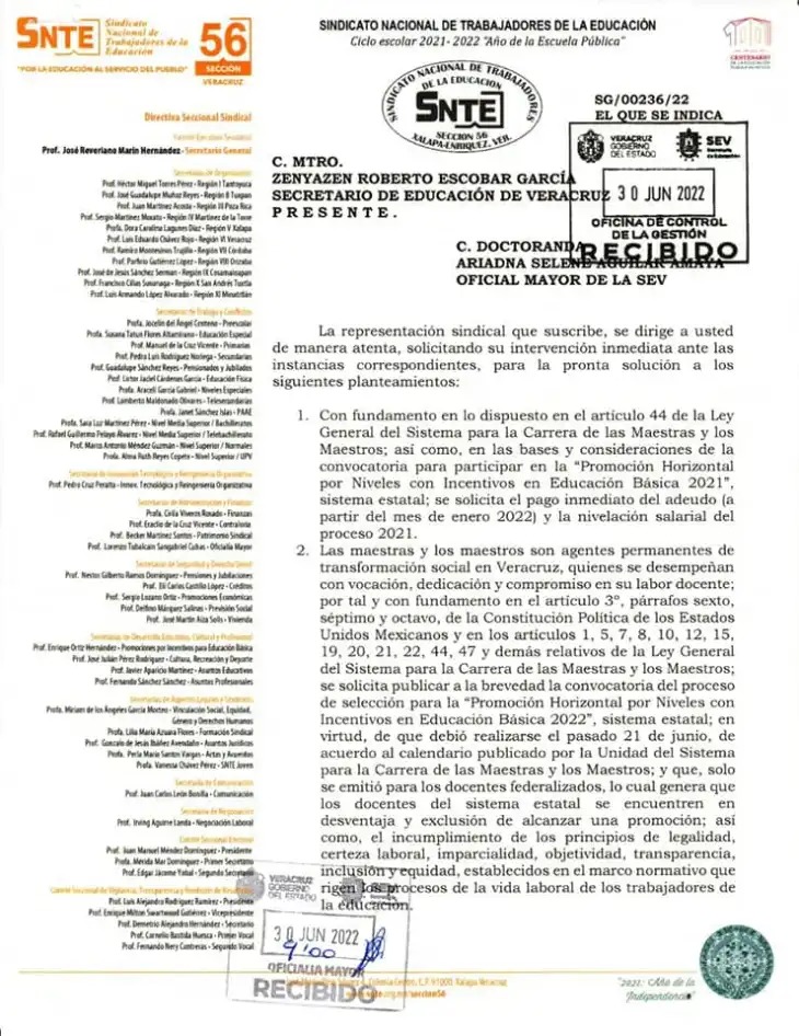 A través del oficio SG/00236/22, de fecha 29 de junio del año en curso, dirigido al Secretario de Educación de Veracruz (SEV), Zenyazen Roberto Escobar García y a la oficial mayor de la dependencia Ariadna Selene Aguilar Amaya, demandan el pago inmediato del adeudo a partir del mes de enero del 2022 y la nivelación salarial del proceso 2021 para los maestros del sistema estatal.