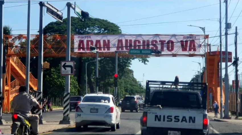 "Adán Augusto Va", dicen las mantas que vienen con la leyenda "Morena" y usando los colores de este partido político.