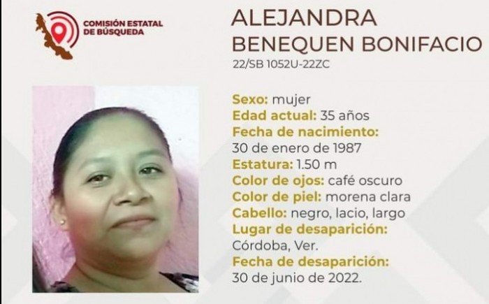 La mujer Alejandra Benequen Bonifacio de 35 años, desaparecio en el municipio de Córdoba el jueves 30 de junio, y cuenta con 1.50 metros de estatura, ojos cafés oscuros, de tez morena clara, con cabello negro, lacio y largo, además de que tiene nariz chata, boca mediana con labios delgados y cicatriz en rodilla derecha.