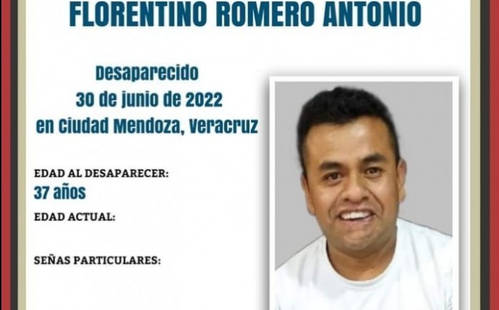 El mismo día, Florentino Romero Antonio de 37 años, desaparecio en el municipio de Camerino Z. Mendoza, mismos que cuenta con una estatura aproximada de 1.65 metros, de tez morena clara, ojos cafés oscuros y con cabello corto, negro y crespo.