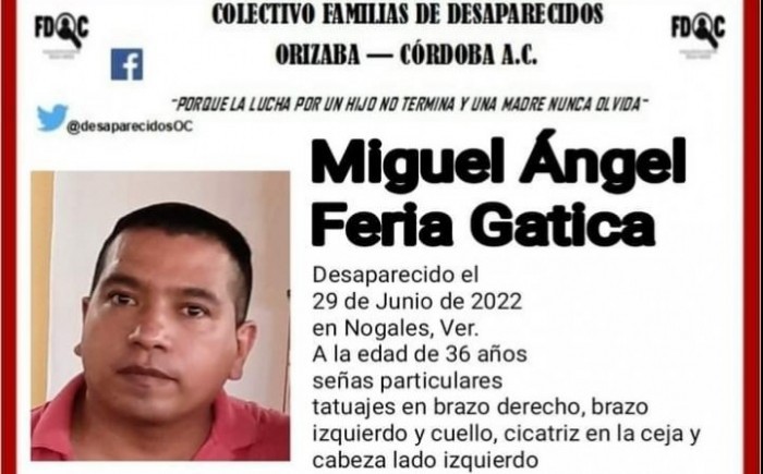 Mientras que Miguel Ángel Feria Gatica de 36 años, desaparecio en el municipio de Nogales, mismo que cuenta con 1.78 metros de estatura, ojos cafés claros, de tez morena clara, con cabello negro, lacio y corto, además de que tiene tatuajes en brazo derecho e izquierdo y en cuello, y una cicatriz en la ceja y en la cabeza de lado izquierdo