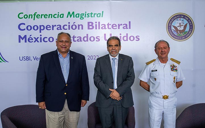Ante un auditorio conformado por la comunidad universitaria, miembros de la Secretaría de Marina, personal de la Marina estadounidense y miembros de la Embajada de México en Estados Unidos, Del Toro impartió la conferencia “Cooperación bilateral México-Estados Unidos”.