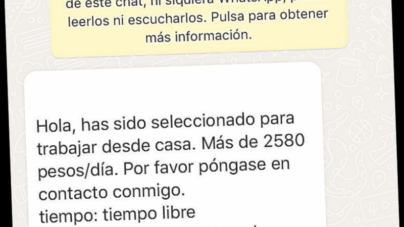 “Hola, has sido seleccionado para trabajar desde casa. Más de 2580 pesos/ día. Por favor póngase en contacto conmigo. Tiempo: tiempo libre”.