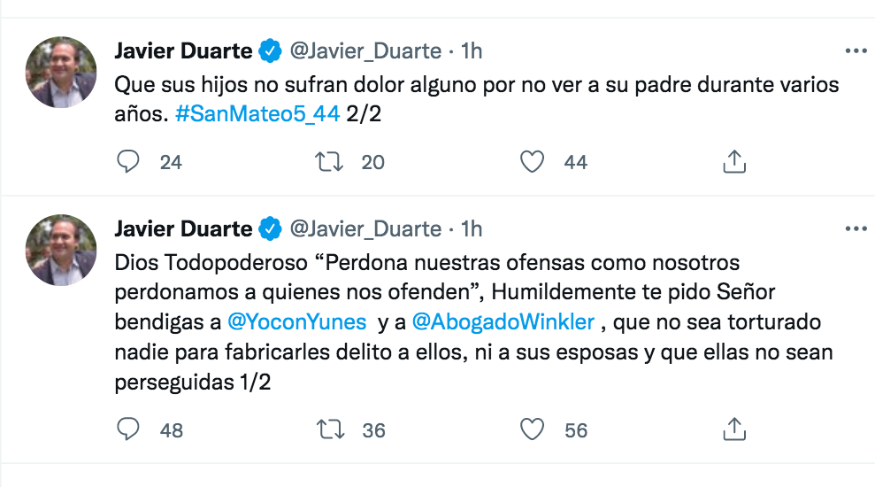 “Dios Todopoderoso Perdona nuestras ofensas como nosotros perdonamos a quienes nos ofenden”, Humildemente te pido Señor bendigas a @YoconYunes y a @AbogadoWinkler, que no sea torturado nadie para fabricarles delito a ellos, ni a sus esposas y que ellas no sean perseguidas”, escribió el exgobernador en clara alusión a su caso, donde su exesposa Karime Macías también es investigada.