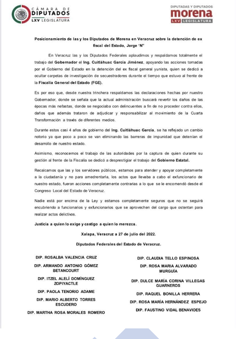 Dicho posicionamiento de las y los legisladores señala de manera textual: «En Veracruz las y los diputados federales aplaudimos y respaldamos totalmente el trabajo del Gobernador, apoyando las acciones tomadas en la detención del ex fiscal general Jorge «N», quién se dedicó a ocultar carpetas de investigación de secuestradores durante el tiempo que estuvo al frente de la Fiscalía General del Estado».