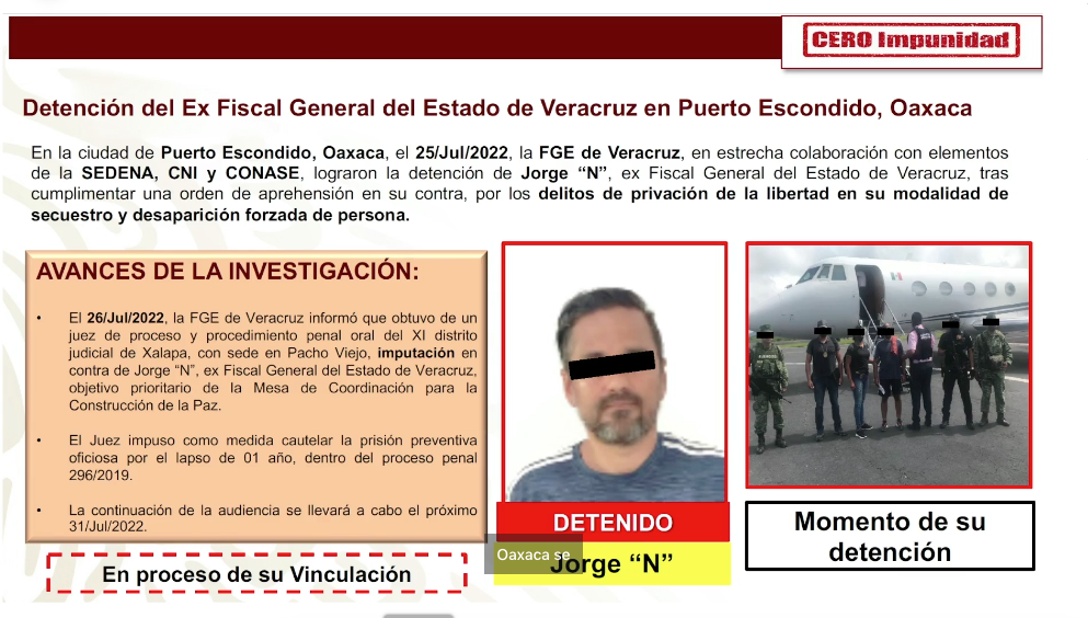 Señaló que se cumplimentó una orden de aprehensión en su contra por los delitos de privación de la libertad en su modalidad de secuestro y desaparición forzada de persona.