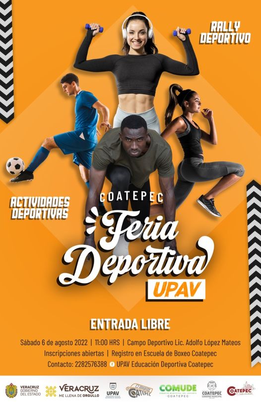 El H. Ayuntamiento de Coatepec en coordinación con la Universidad Popular Autónoma de Veracruz, sede Coatepec, invitan a la población a inscribirse para participar en la Feria Deportiva UPAV 2022, que se llevará a cabo el sábado 06 de agosto a las 11 hrs. en el campo deportivo Lic. Adolfo López Mateos.