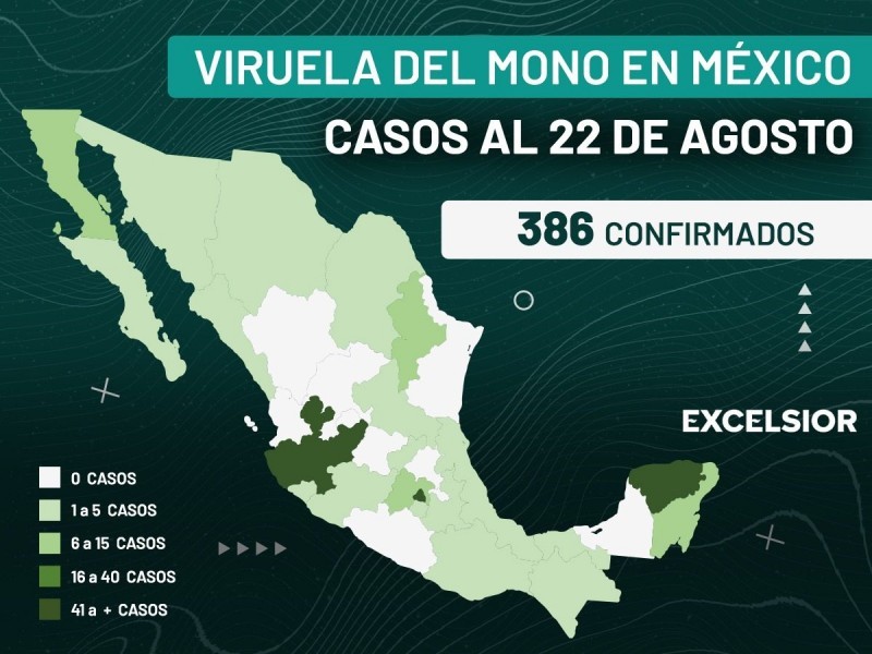 Los casos de viruela del mono en México pasaron de 252 a 386 en una semana y aumentaron de 20 a 24 los estados que han reportado contagios, informó la Secretaría de Salud.